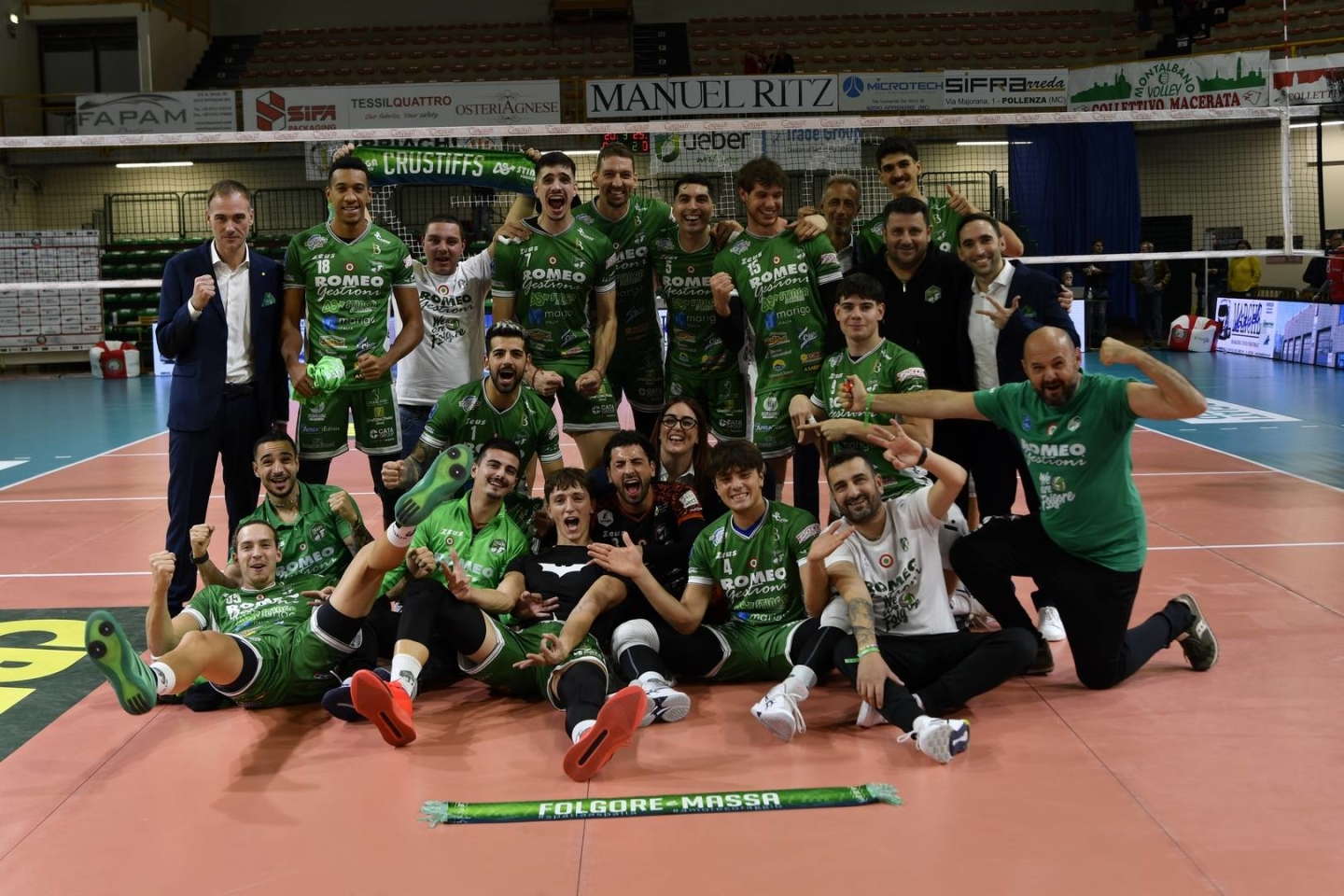 Baldi con due attacchi e il muro di Pol portano avanti la Romeo (1-3). Petkov in attacco (2-4). Macerata impatta (4-4) ma rispondono Pol in pipe e il lungolinea di Baldi (4-6). Patriarca mette a terra due chiodi (6-8). Pol prima col block-out e poi col muro costringe Macerata al timeout (7-11). Baldi e Petkov aumentano il gap (9-14). Reazione dei marchigiani e timeout per mister Esposito (11-14). Parraguirre conquista subito il servizio (11-15). Macerata prova a ricucire ma Baldi, Patriarca e Pol continuano a spingere (16-20), sull'errore in attacco dei suoi mister Giannini chiama timeout (16-21). Altri due errori per i biancorossi e il match lo chiude un'inchiodata di Patriarca (20-25).
